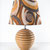 Questa elegante lampada da tavolo artigianale unisce materiali naturali e design di carattere. La base in legno tornito, dalle linee tondeggianti e armoniose, si abbina perfettamente al paralume in tessuto con fantasia geometrica anni ’70, caratterizzata da cerchi e motivi astratti nei toni caldi dell’ocra, marrone e beige.