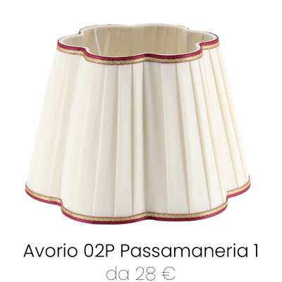 Paralume Margherita plissettato a mano in tessuto Pongè Avorio 02P. Rifinito con elegante passamaneria 200. Prodotto realizzato artigianalmente con materiali pregiati Made in Italy. Plissettato a mano, illumina i tuoi ambienti con una luce delicata. Stile classico, perfetto per creare un'atmosfera raffinata.
