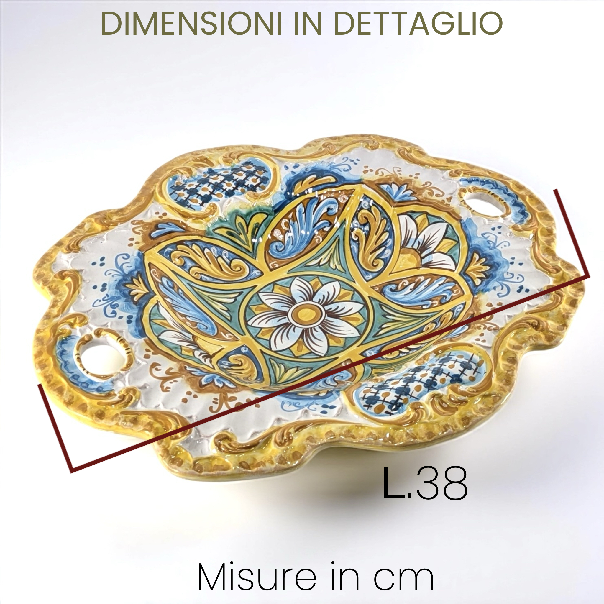 Raffinato centrotavola Ovale L.38 cm in ceramica artigianale di Caltagirone, interamente realizzato e dipinto a mano. Il decoro, ispirato alla tradizione siciliana, presenta un elegante motivo floreale con margherita centrale e dettagli in giallo, blu e verde, esaltati da una bordatura barocca in rilievo.