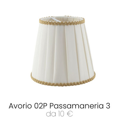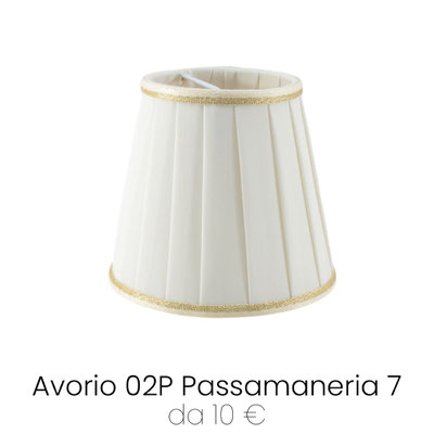Paralume Impero Plissettato con Attacco Molla in tessuto plissettato Pongè Avorio 02P, rifinito con passamaneria 10. Paralume piccolo per lampadari e applique, prodotto realizzato artigianalmente con pregiati materiali Made in Italy. Attacco a Molla Clip: aggancio diretto alla lampadina Mignon E14, un ricambio perfetto anche per lampadari e applique più antichi.